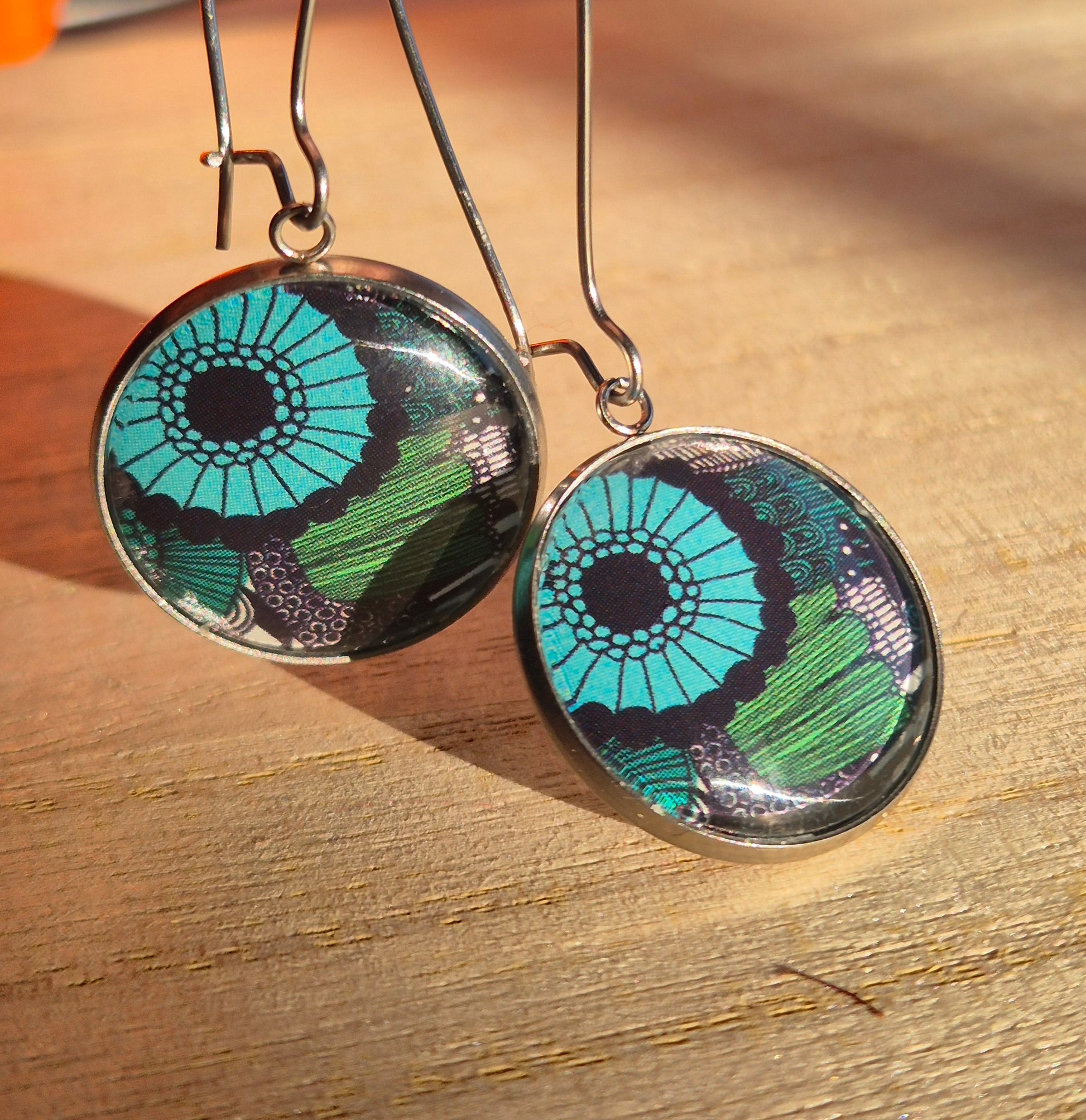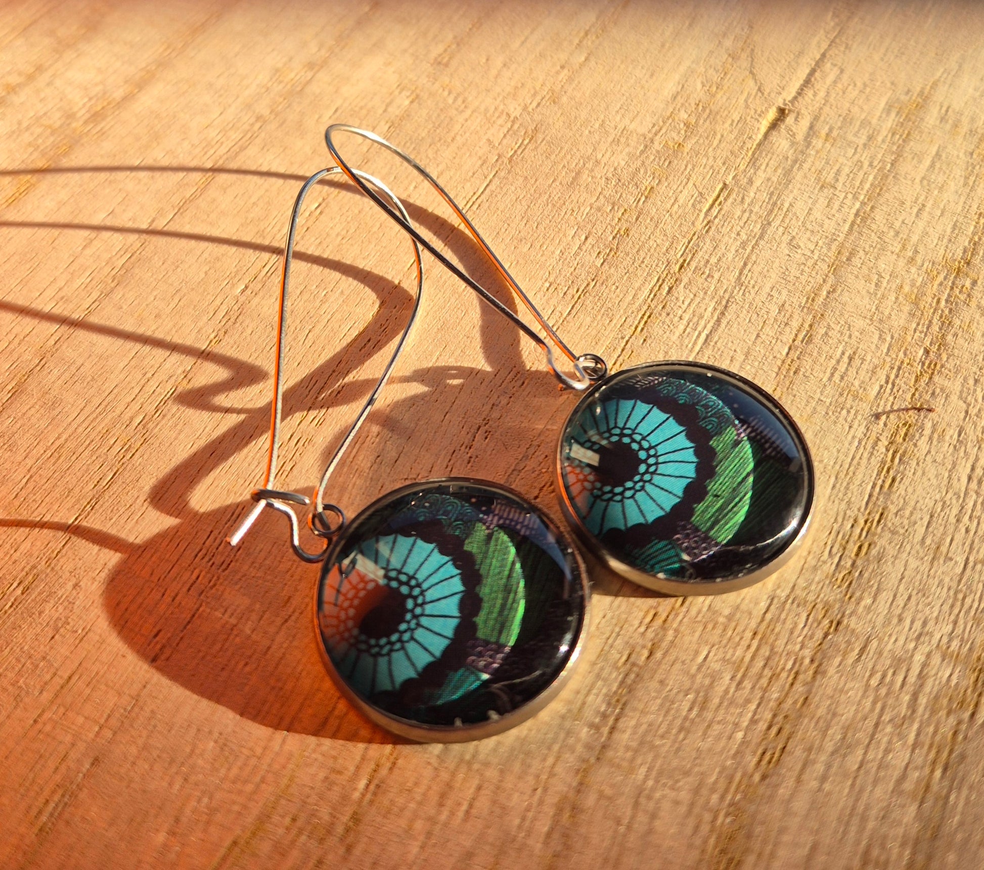 Långa örhängen med mönster från gamla veckotidningar och magasin med ett glas ovanpå.