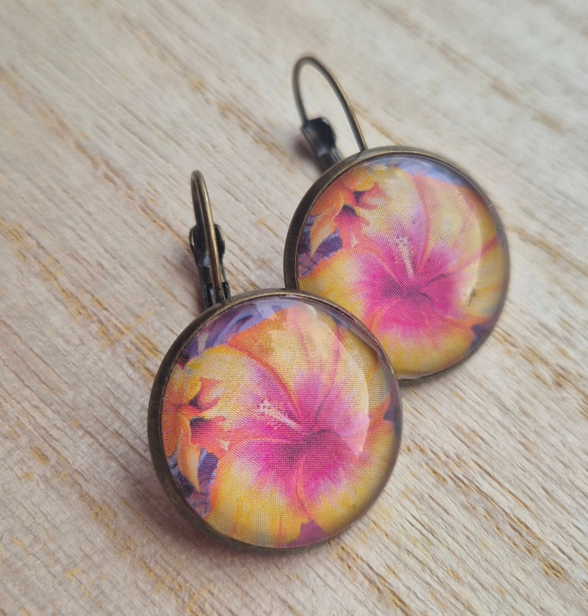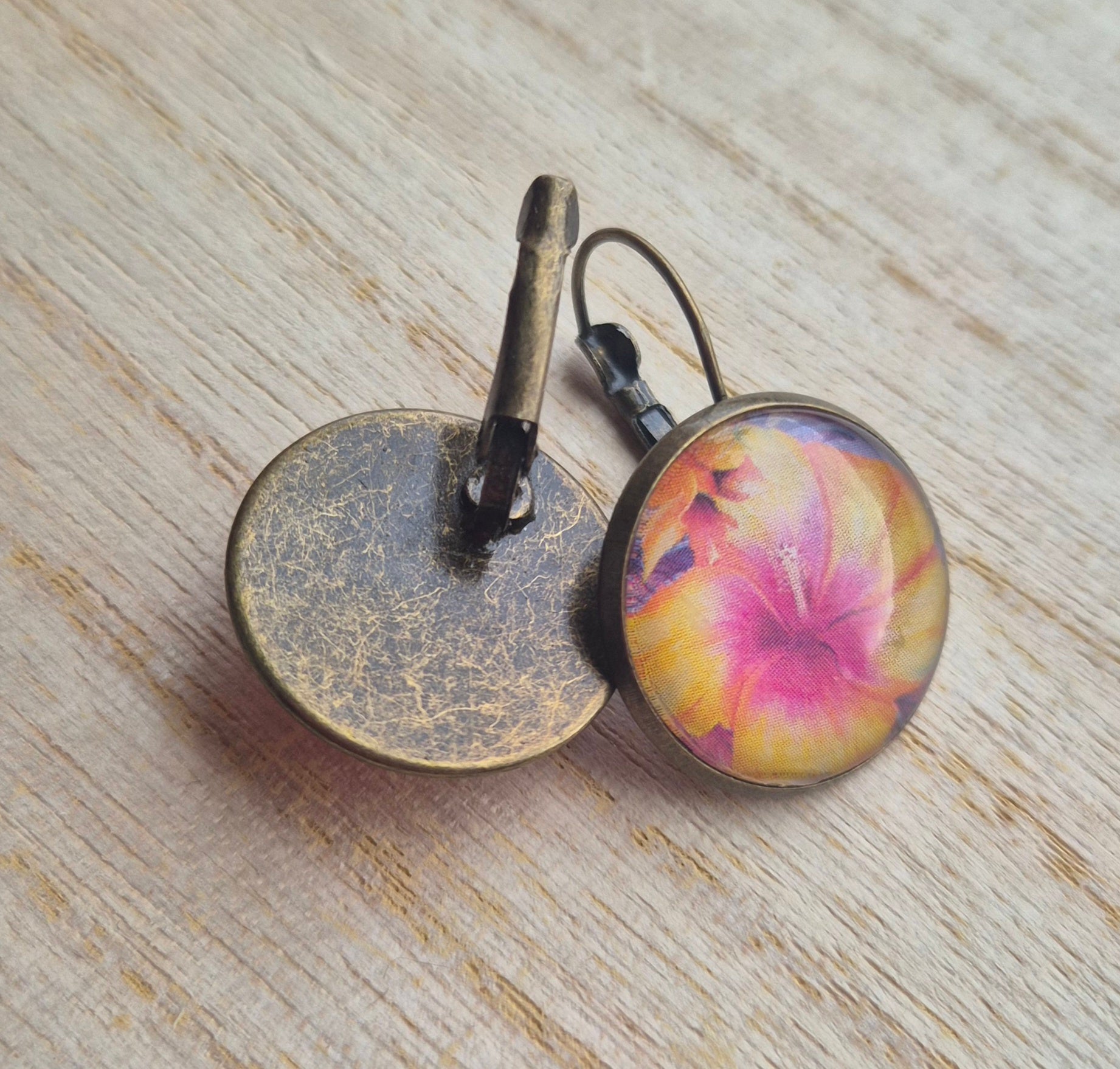 Korta örhängen, bronsfärgad med motiv från gamla veckotidningar och magasin med ett glas ovanpå.