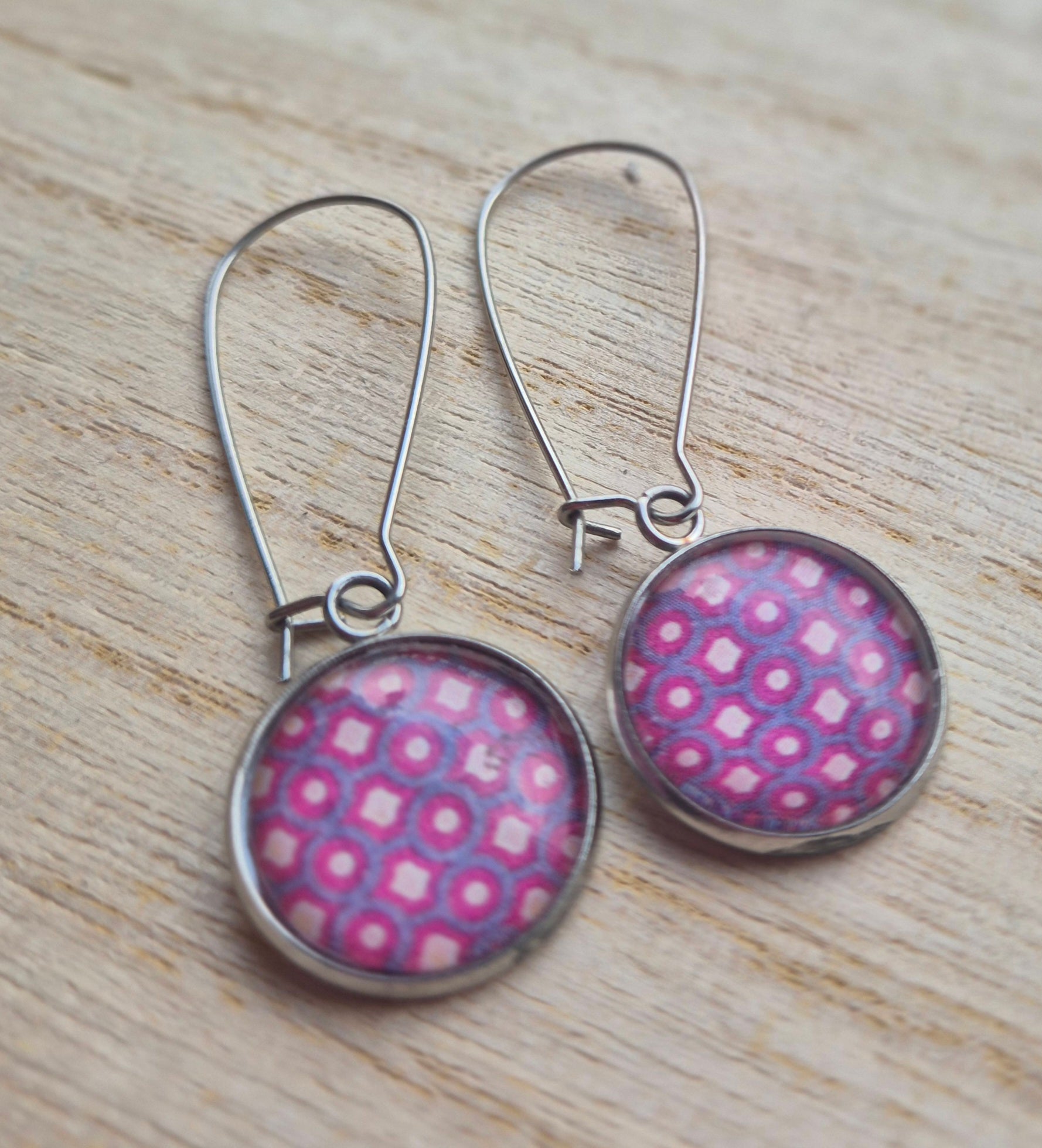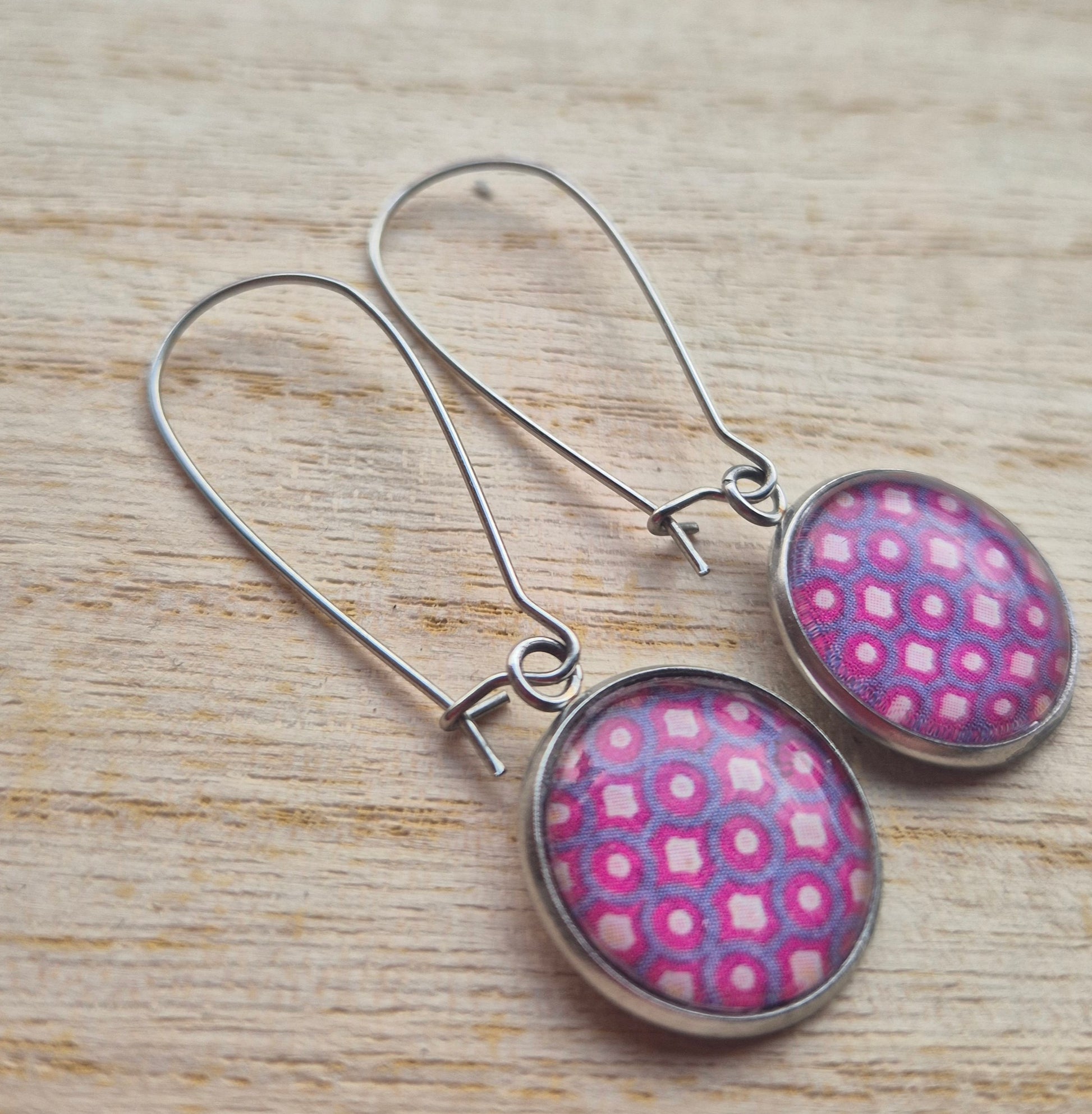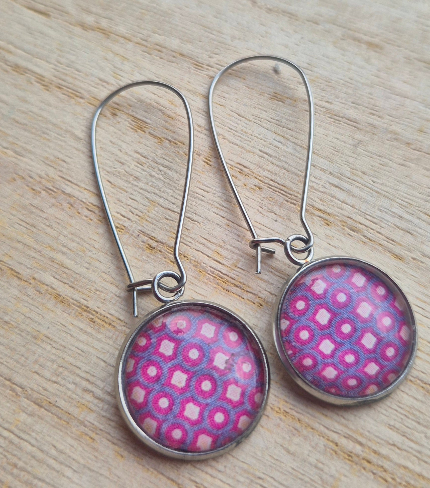 Långa örhängen med mönster från gamla veckotidningar och magasin med ett glas ovanpå.