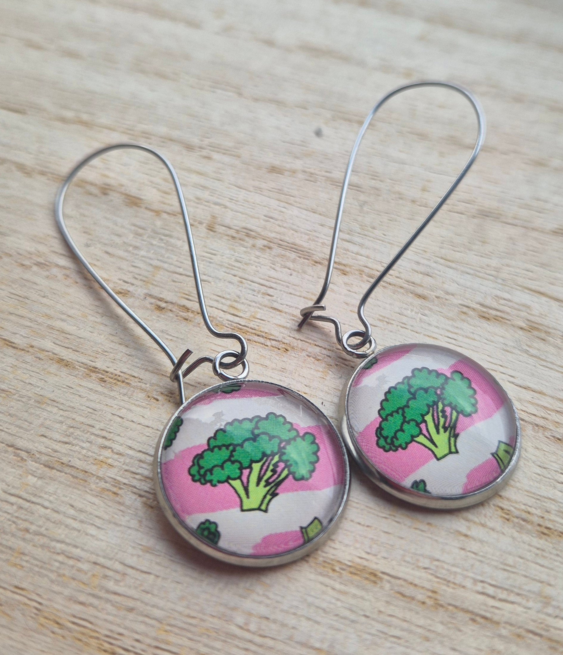 Långa örhängen med mönster från gamla veckotidningar och magasin med ett glas ovanpå.