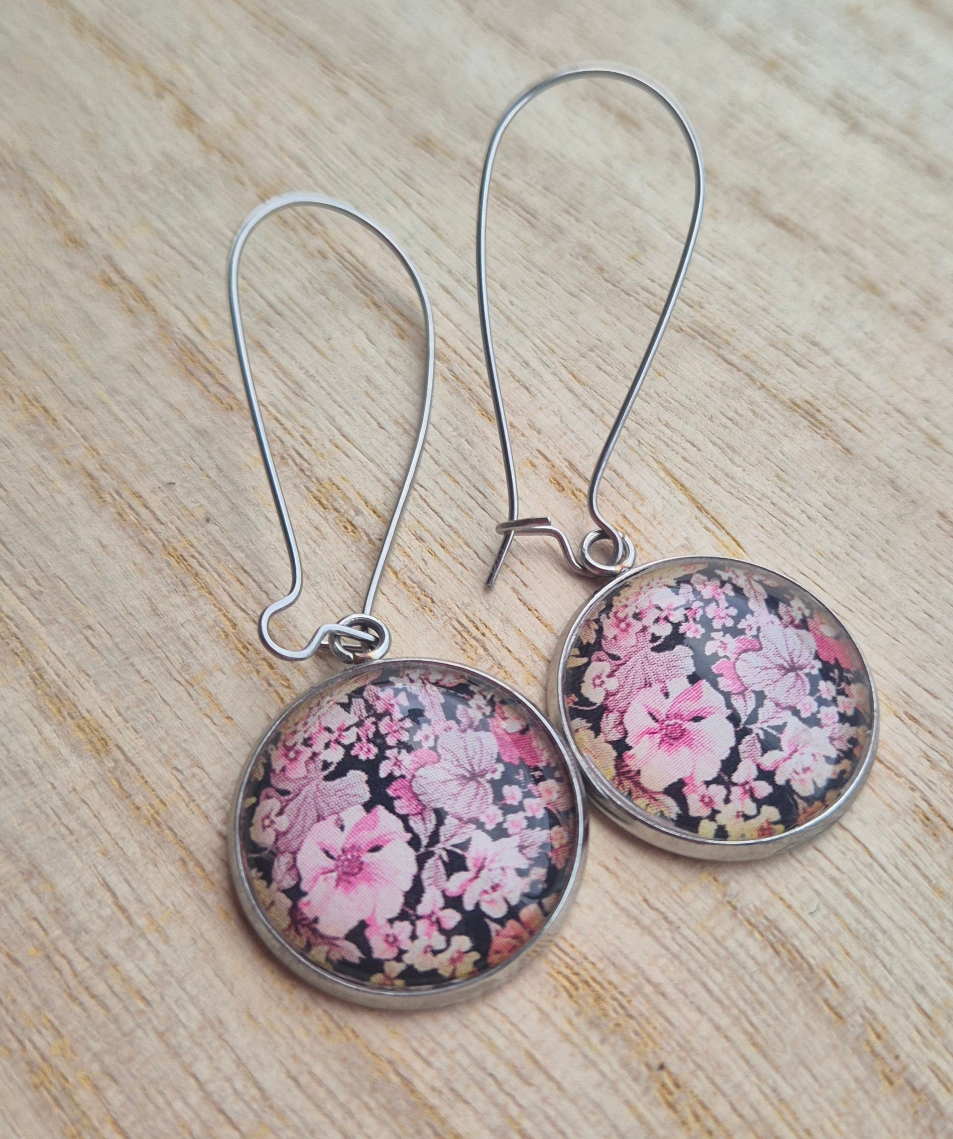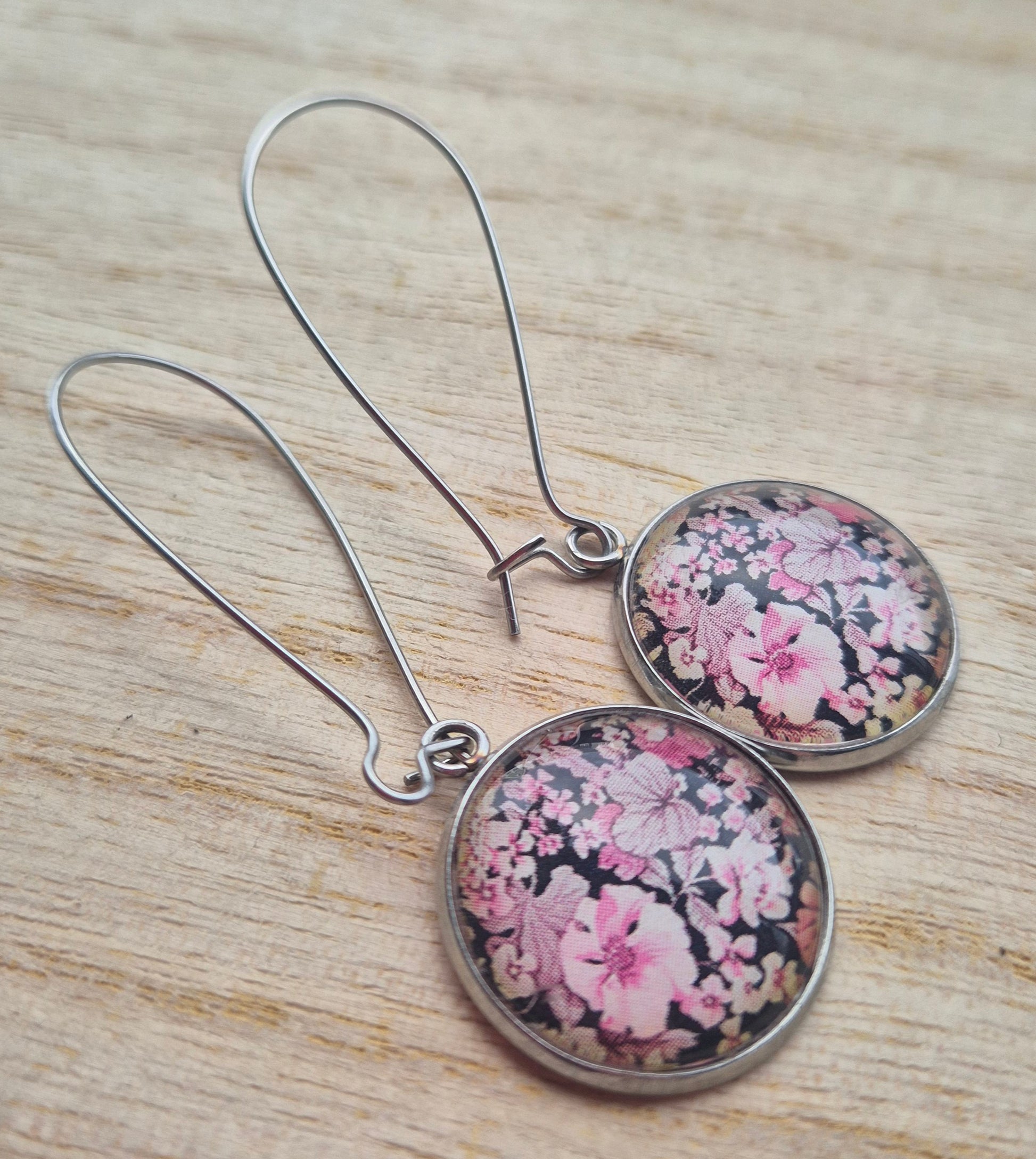 Långa örhängen med mönster från gamla veckotidningar och magasin med ett glas ovanpå.