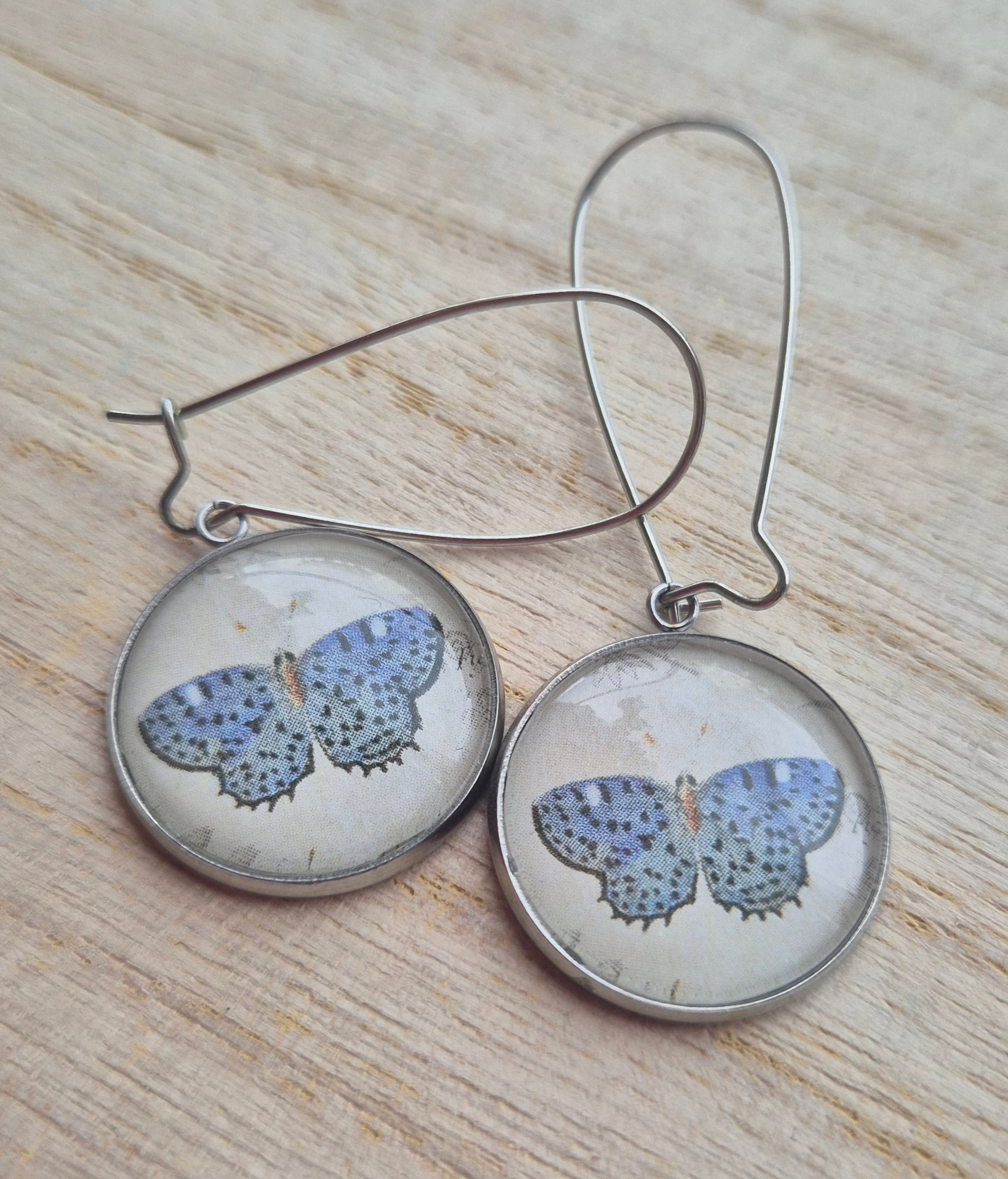 Långa örhängen med mönster från gamla veckotidningar och magasin med ett glas ovanpå.