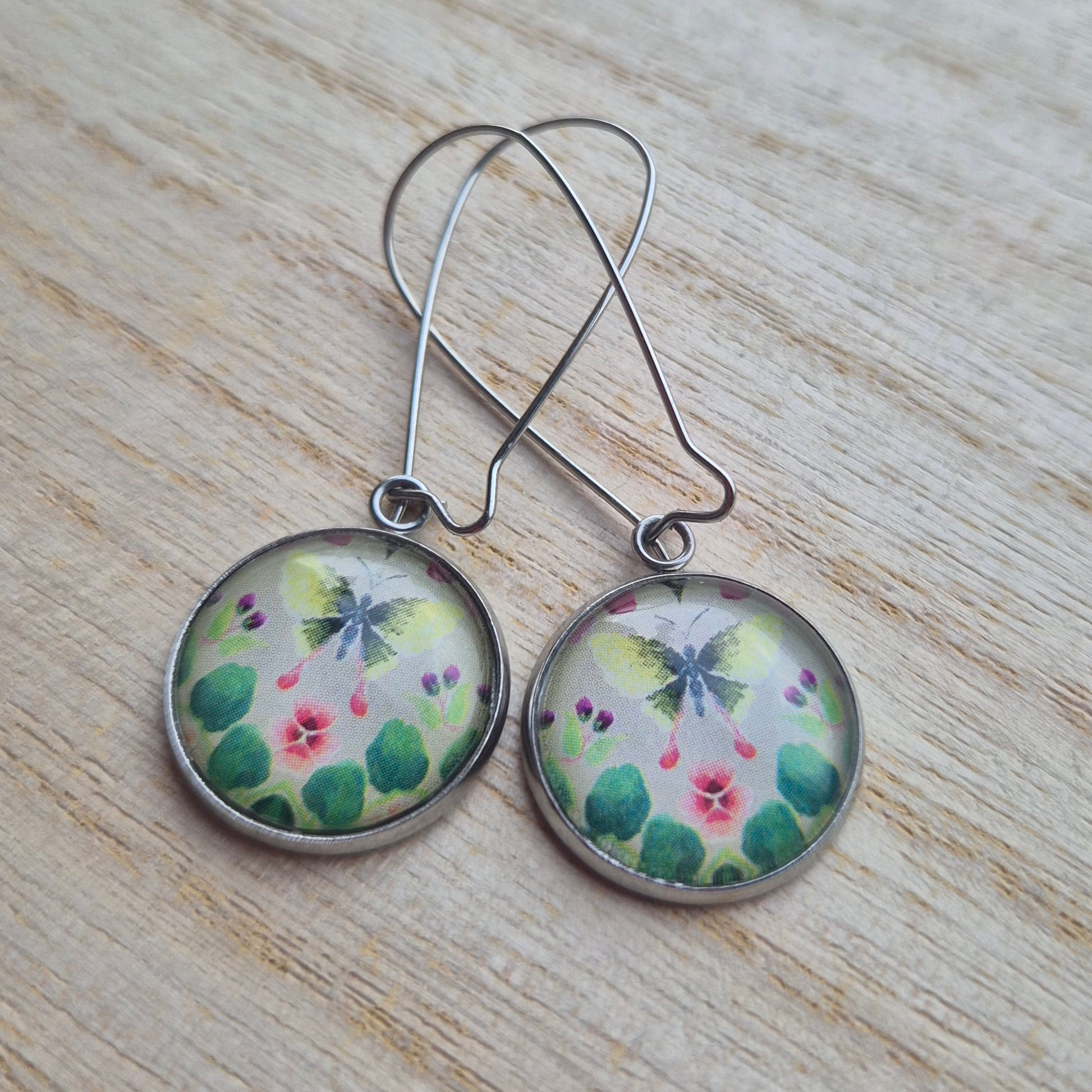 Långa örhängen med mönster från gamla veckotidningar och magasin med ett glas ovanpå.