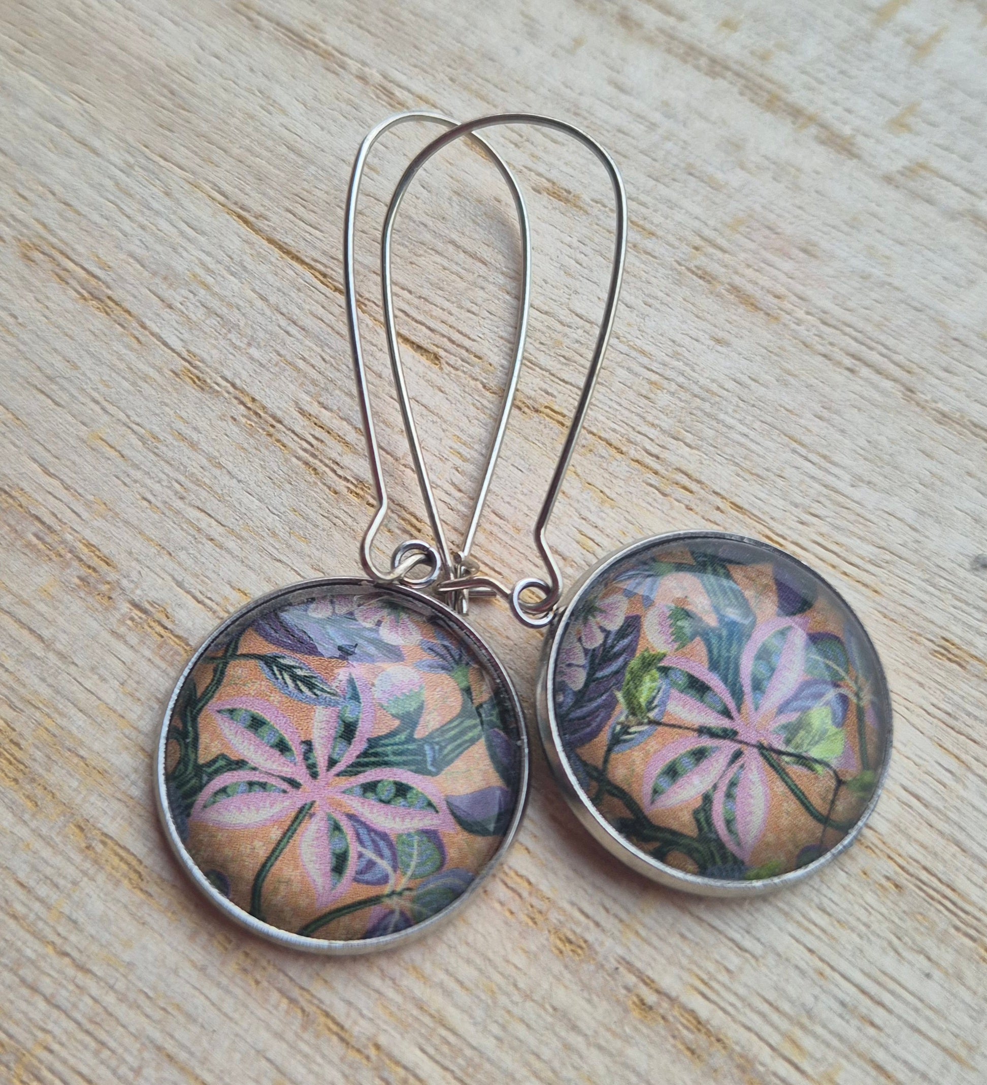 Långa örhängen med mönster från gamla veckotidningar och magasin med ett glas ovanpå.